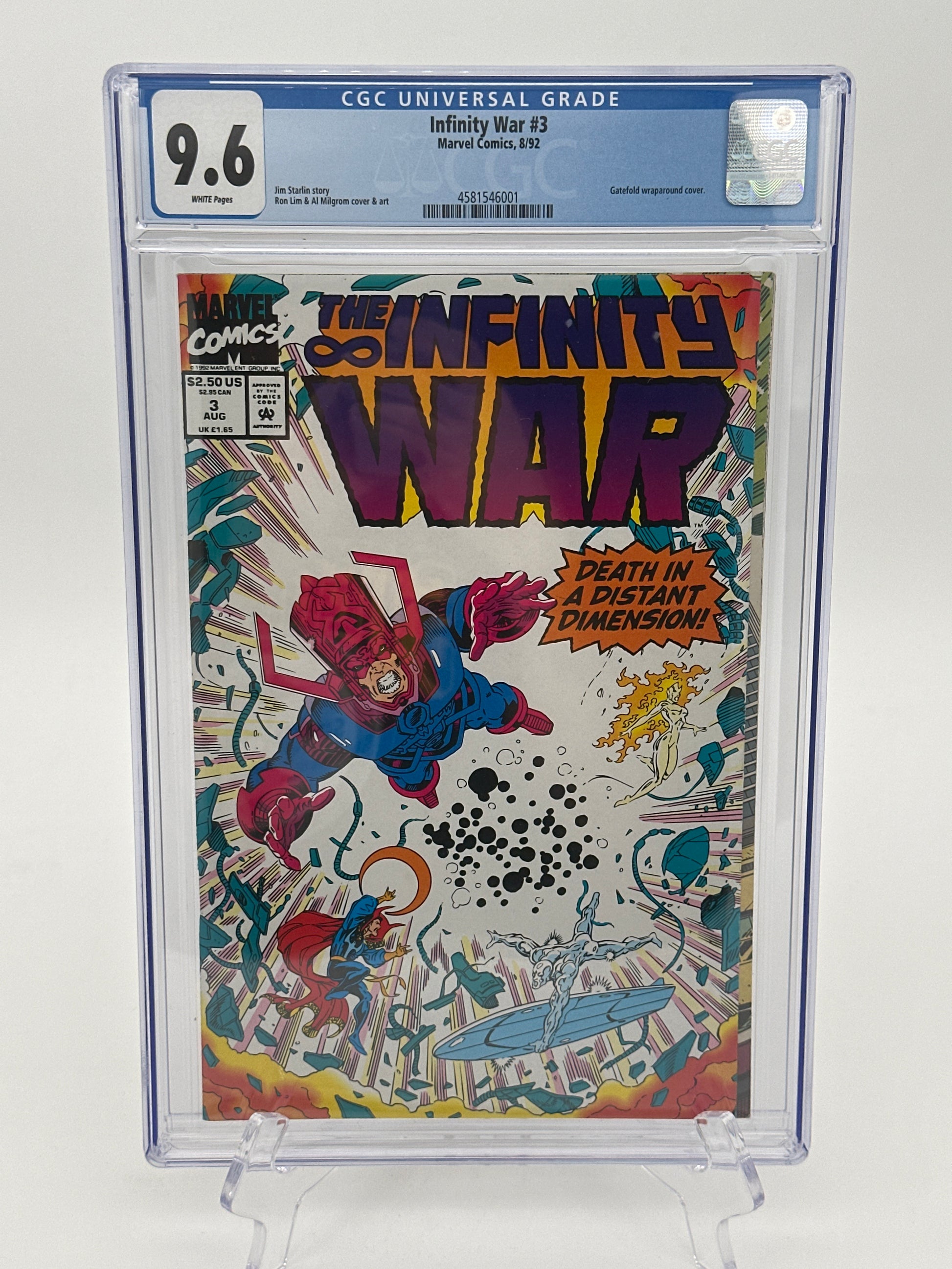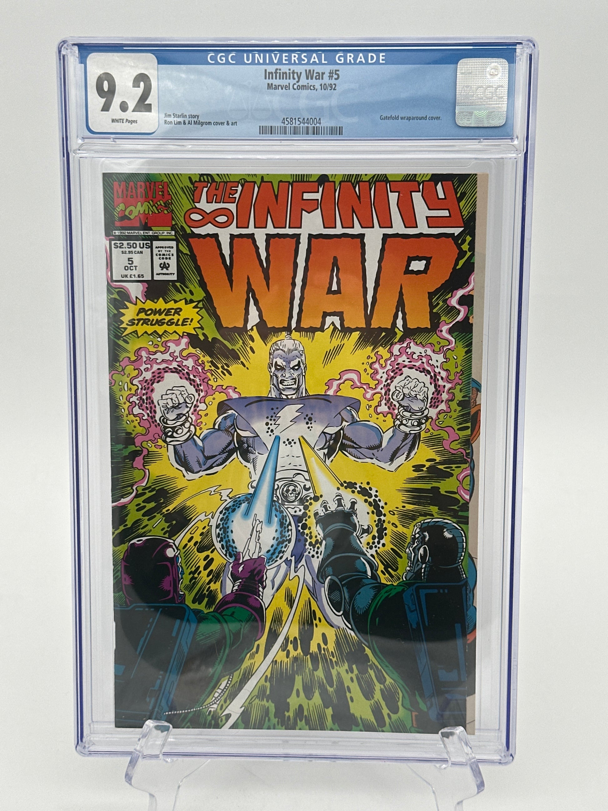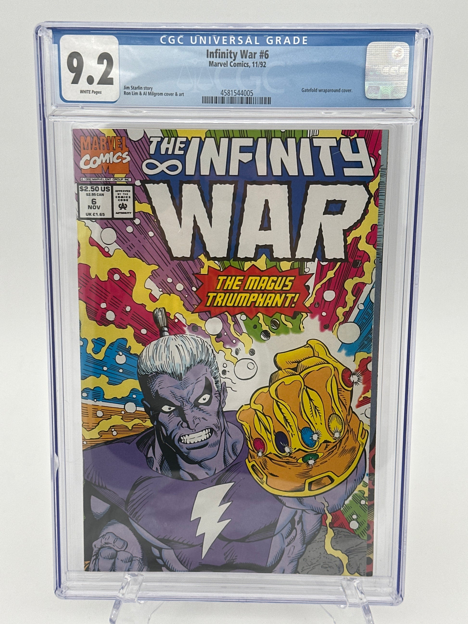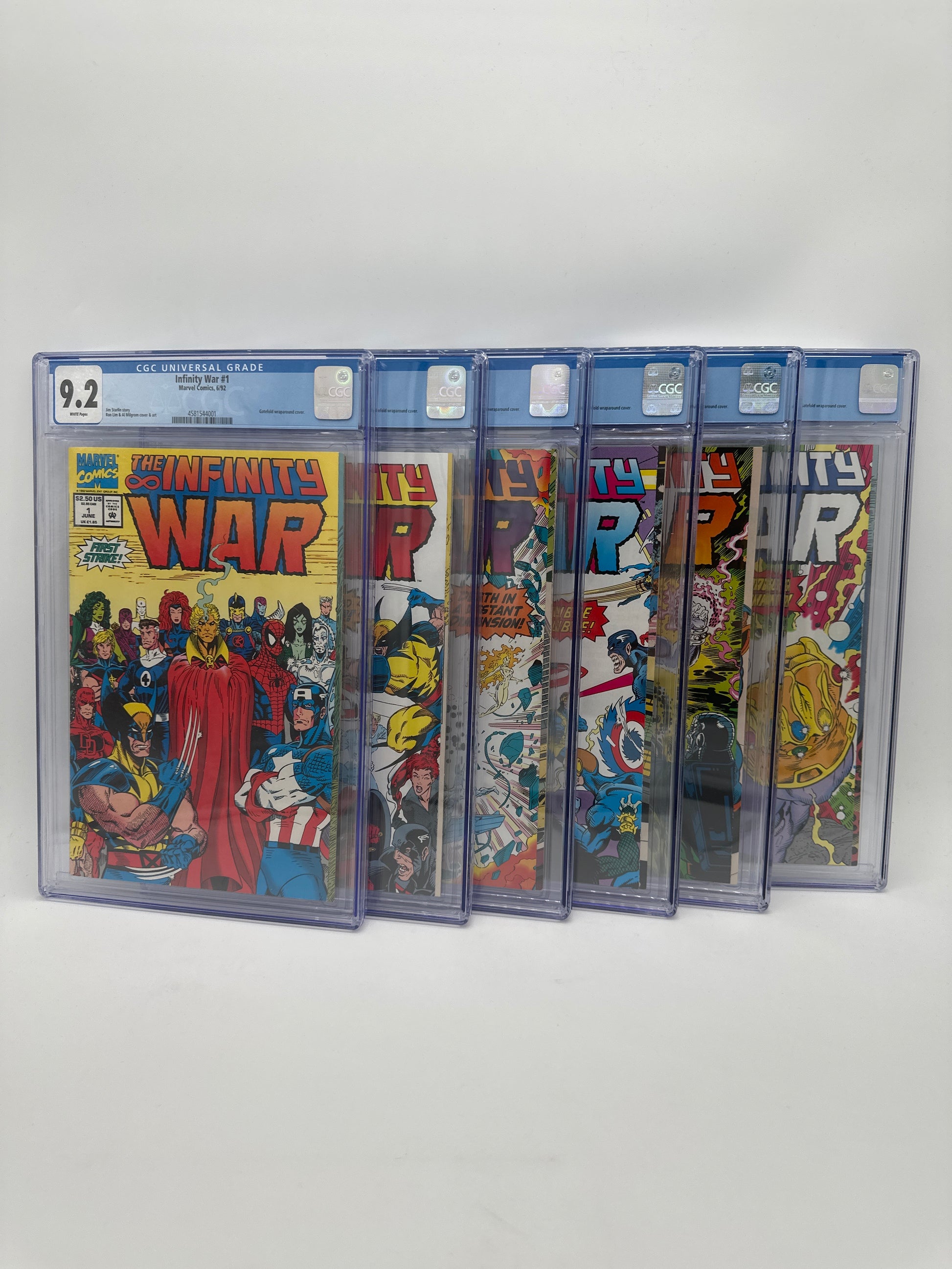 Get this 6 Infinity War comic collection, all graded, to add to your collection! These 1992 Modern Aged Comics showcase the madness the comes from The Magus, the evil counterpart of Adam Warlock himself. Watch as evil doppelgangers come to fight the earth heroes. Thanos and the Infinity Watch seek out help. Tons of trickery caused by Magus. Adam Warlock attempting to assemble the Infinity Gauntlet to fight against Magus. Thanos helps distract Magus; Adam Warlock gets the Gauntlet and releases Eternity and Infinity which lock Magus in the Soul Stone forever. With Warlock in comatose, the good counterpart, "The Goddess" emerges posing as the next new threat!